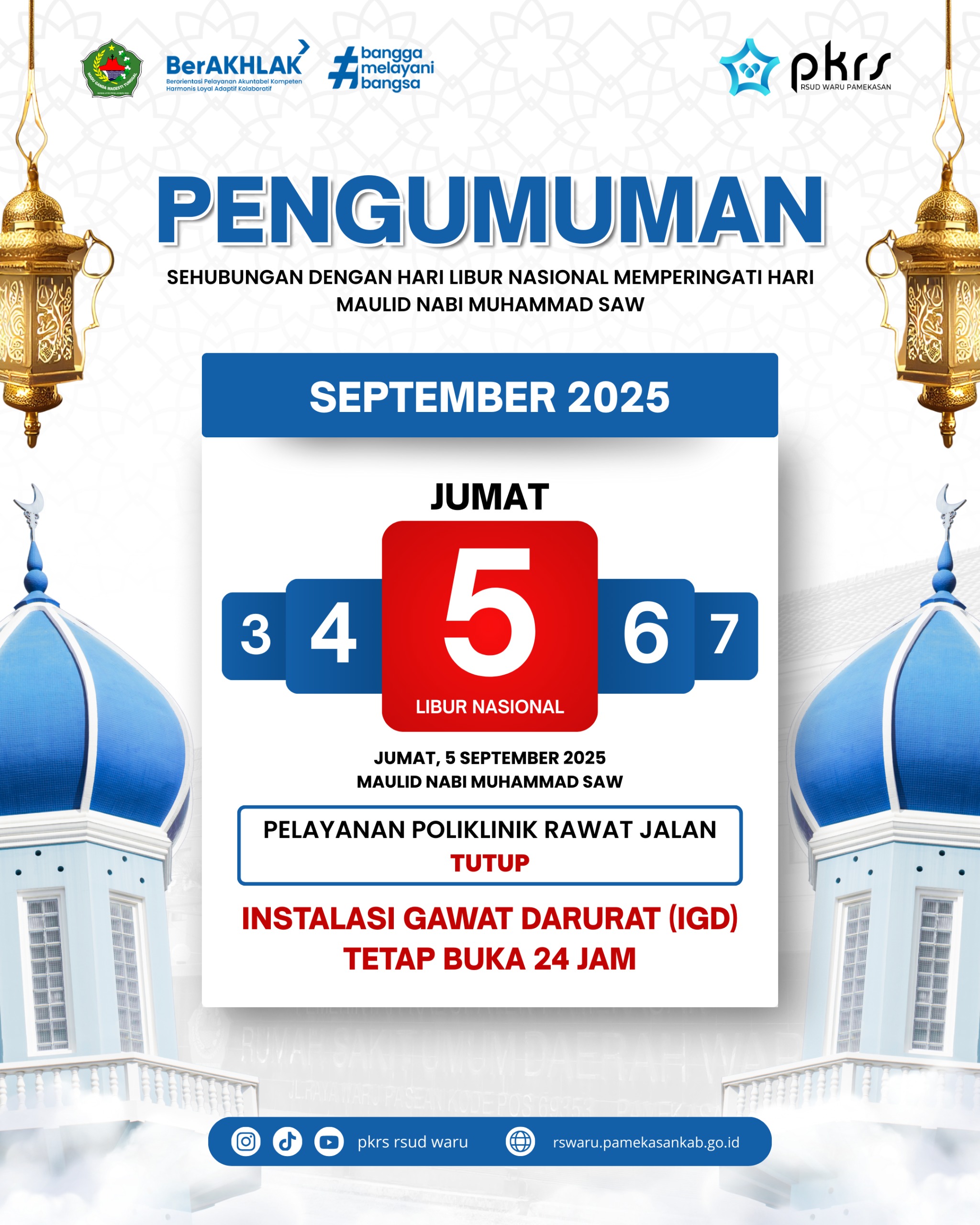 Sehubungan dengan Hari Libur Nasional dalam rangka memperingati Maulid Nabi Muhammad SAW. Pada Hari Jum’at, 5 September 2025 Pelayanan Poliklinik Rawat Jalan dan Administrasi RSUD Waru Pamekasan LIBUR. Layanan Instalasi Gawat Darurat (IGD) tetap buka 24 Jam. Pelayanan Poliklinik dan Administrasi buka kembali pada Hari Sabtu, 6 September 2025.