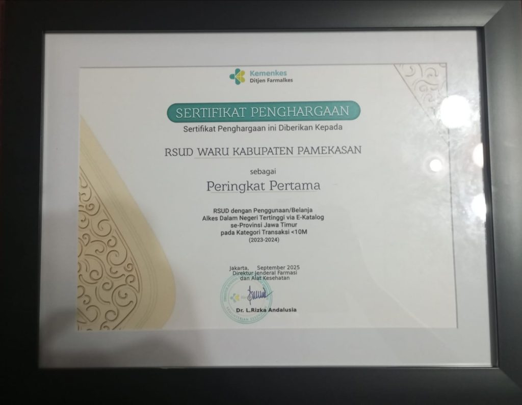Pada gelaran Business Matching Perbekalan Kesehatan Dalam Rangka Mendorong Pengembangan Produk Dalam Negeri yang diadakan oleh Kementerian Kesehatan pada tanggal 10-12 September 2025 di Hotel Santika Premier Kota Malang, RSUD Waru berhasil menduduki Peringkat Pertama dalam penggunaan Alat Kesehatan Dalam Negeri tertinggi via E-Katalog se Provinsi Jawa Timur dalam kategori Transaksi di Bawah 10 Miliar. Ini adalah kali pertamanya bagi RSUD Waru mendapatkan penghargaan tersebut. Pemberian Penghargaan ini diwakilkan kepada Fithri Dwi Kurniasih selaku Kepala Gudang Farmasi Instalasi Farmasi RSUD Waru Pamekasan